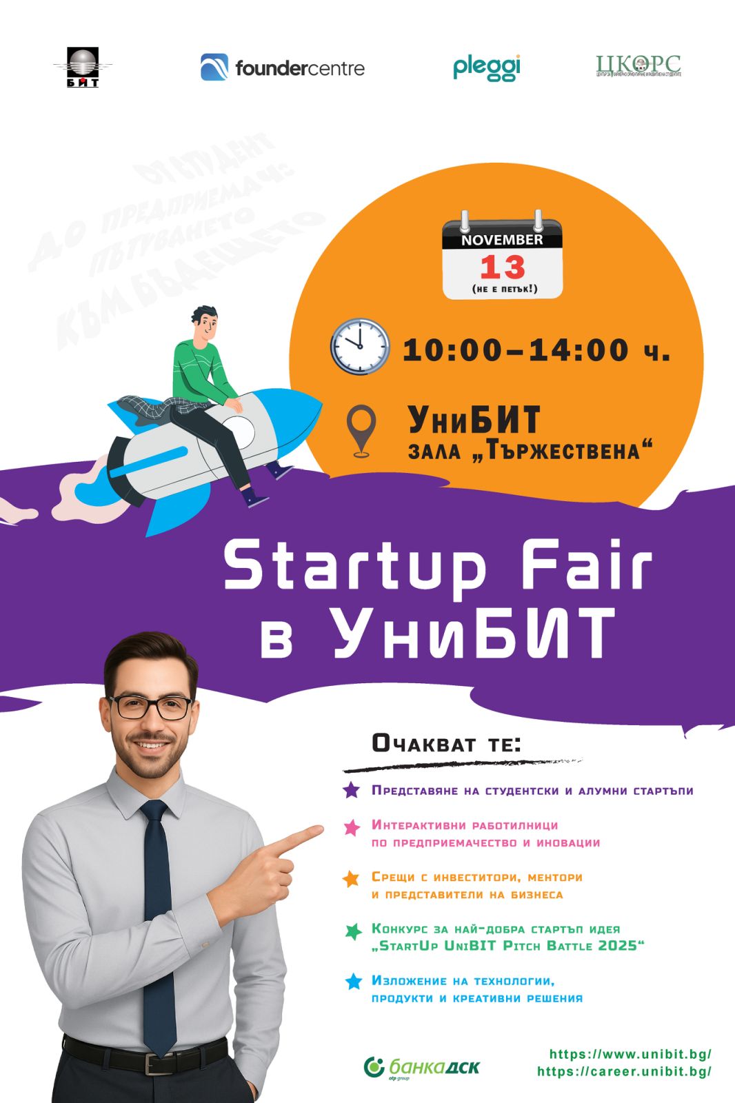 Имаме удоволствието да Ви поканим да участвате в Хакатон, който ще се проведе в рамките на Startup Fair на 3 ноември 2025 г. от 11.00ч. в Учебен музей, етаж 3, сграда УниБИТ 1. Събитието предоставя отлична възможност да развиете своите идеи, да работите в екип и да създадете иновативни решения в сферата на информационните технологии, предприемачеството и креативните индустрии.